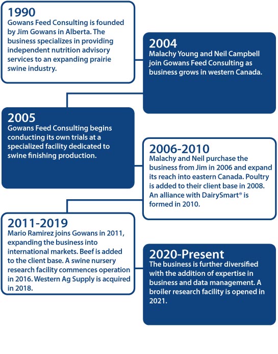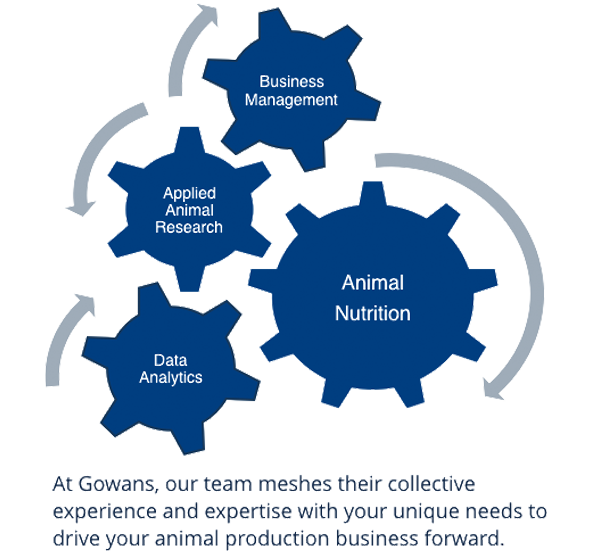 Gowans is a group of professionals who provide multidisciplinary services and support to the world’s animal production sector. Our specialized team of experts represent over 100 years of cumulative experience working in the poultry, swine, beef, and dairy production businesses. We stress the importance of working on site with our clients to develop and implement customized solutions for their animal nutrition and business needs. Our practice is evidence based, with an emphasis on science and research rather than tradition or convention.